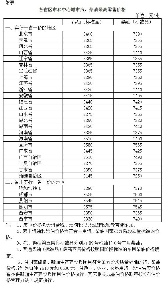 根据近期国际市场油价变化情况,按照现行成品油价格形成机制,自2018年2月28日24时起,国内汽、柴油价格(标准品,下同)每吨分别降低190元和185元。调整后,各省(区、市)和中心城市汽、柴油最高零售价格见附表。相关价格联动及补贴政策按现行规定执行。