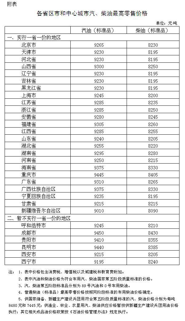 根据近期国际市场油价变化情况,按照现行成品油价格形成机制,自2018年8月6日24时起,国内汽、柴油价格(标准品,下同)每吨均提高70元。调整后,各省(区、市)和中心城市汽、柴油最高零售价格见附表。相关价格联动及补贴政策按现行规定执行。
