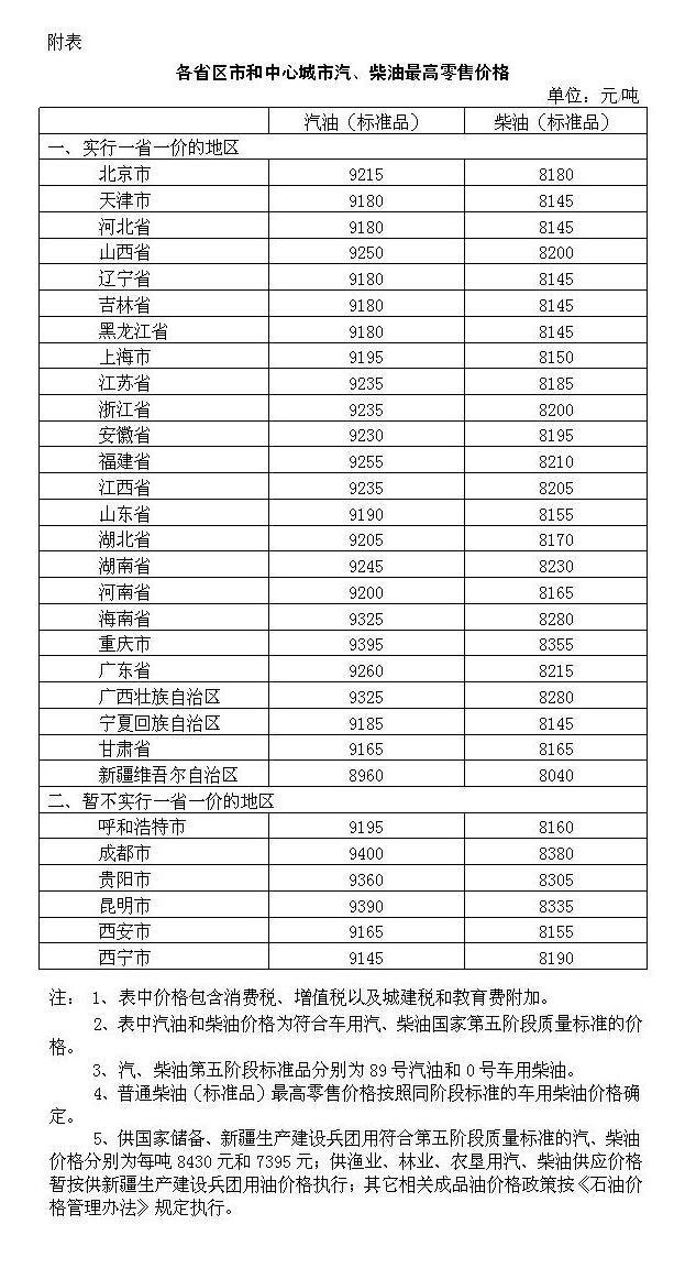 附:各省区市和中心城市汽、柴油最高零售价格