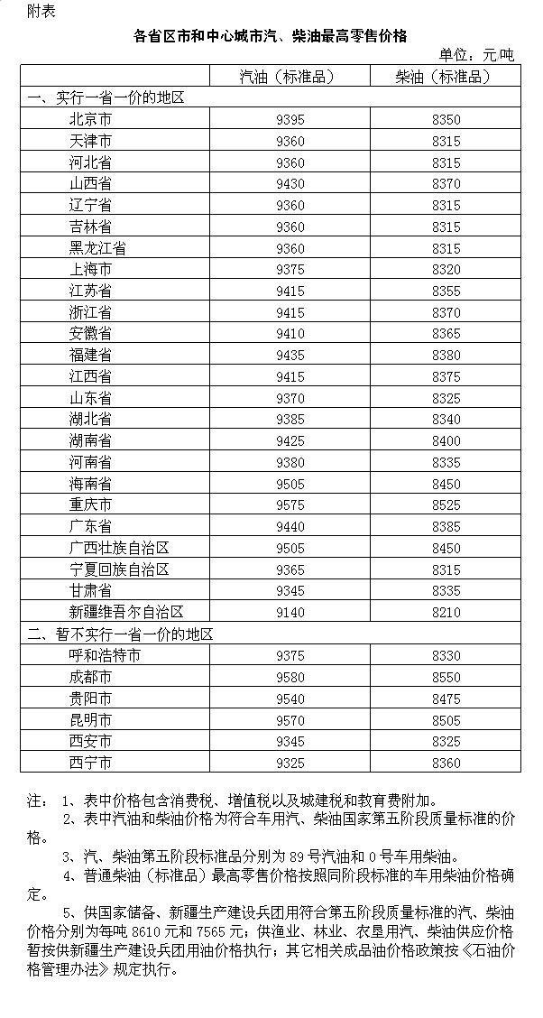 附:各省区市和中心城市汽、柴油最高零售价格