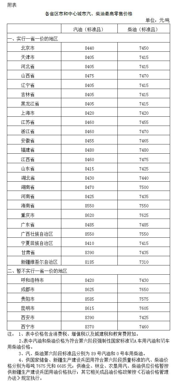 附:各省区市和中心城市汽、柴油最高零售价格