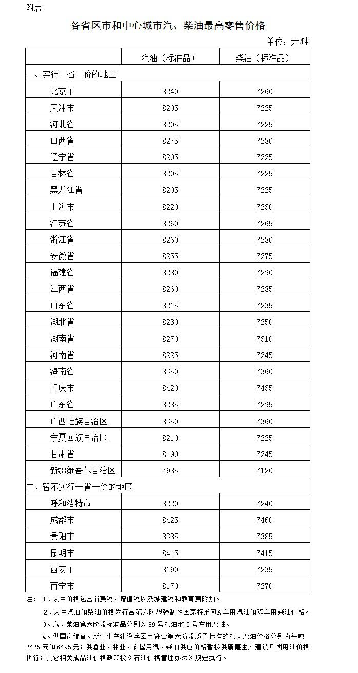 根据近期国际市场油价变化情况,按照现行成品油价格形成机制,自2019年10月21日24时起,国内汽、柴油价格(标准品,下同)每吨分别降低150元和145元。调整后,各省(区、市)和中心城市汽、柴油最高零售价格见附表。相关价格联动及补贴政策按现行规定执行。