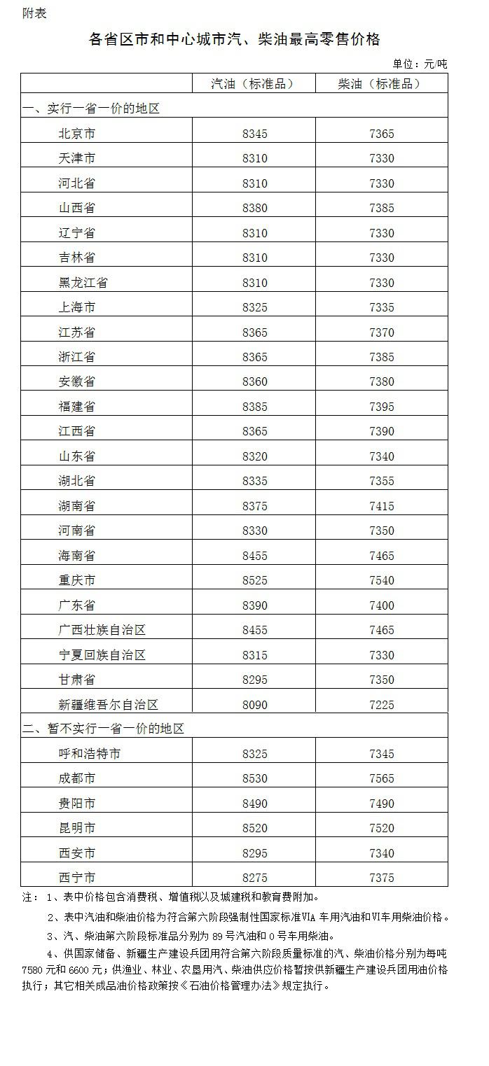 附:各省区市和中心城市汽、柴油最高零售价格