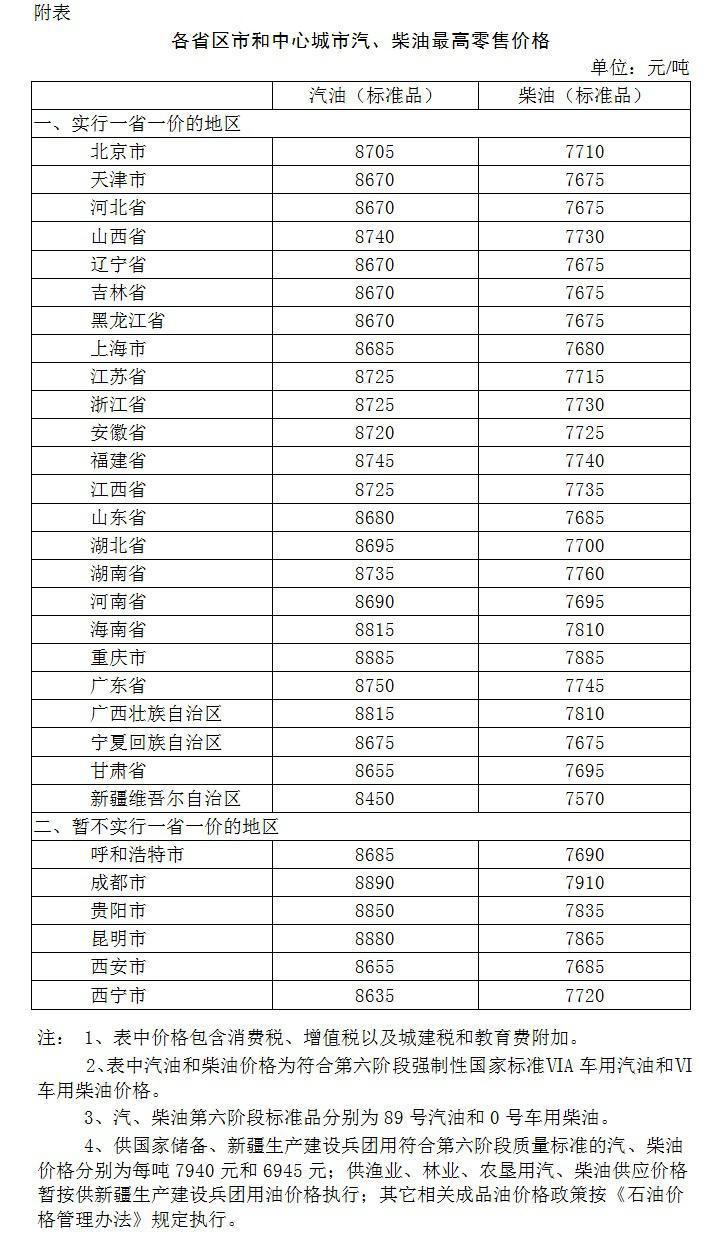 附:各省区市和中心城市汽、柴油最高零售价格