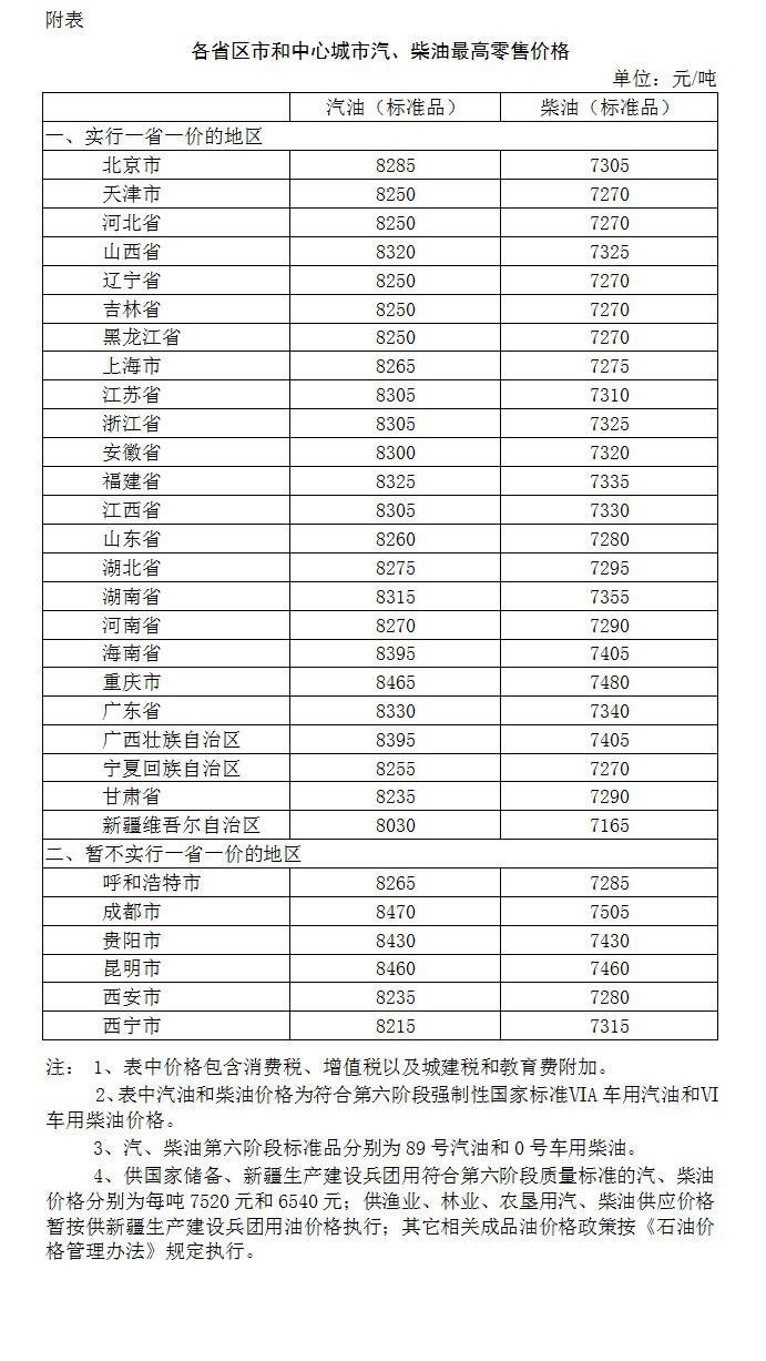 根据近期国际市场油价变化情况,按照现行成品油价格形成机制,自2020年2月4日24时起,国内汽、柴油价格(标准品,下同)每吨分别降低420元和405元。调整后,各省(区、市)和中心城市汽、柴油最高零售价格见附表。相关价格联动及补贴政策按现行规定执行。