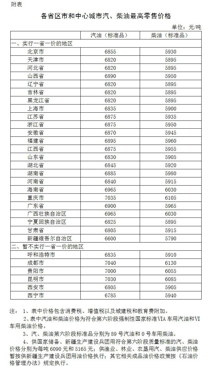 近日国际市场油价持续下跌,按照现行成品油价格形成机制,自2020年3月17日24时起,国内汽、柴油价格(标准品,下同)每吨分别降低1015元和975元。调整后,各省(区、市)和中心城市汽、柴油最高零售价格见附表。相关价格联动及补贴政策按现行规定执行。