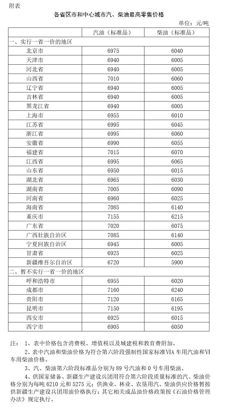 根据近期国际市场油价变化情况,按照现行成品油价格形成机制,自2020年6月28日24时起,国内汽、柴油价格(标准品,下同)每吨分别提高120元和110元。调整后,各省(区、市)和中心城市汽、柴油最高零售价格见附表。相关价格联动及补贴政策按现行规定执行。