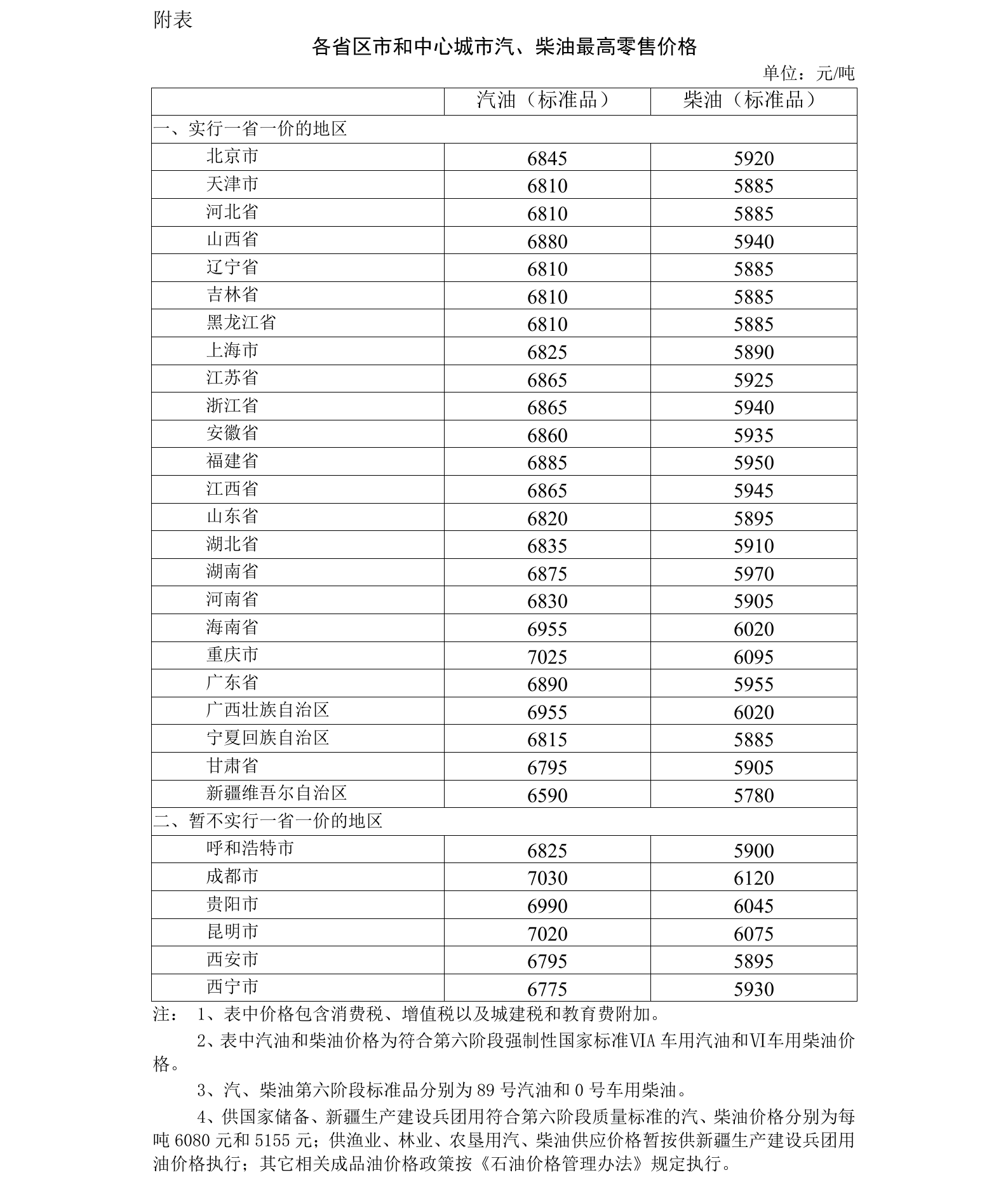 根据近期国际市场油价变化情况,按照现行成品油价格形成机制,自2020年9月18日24时起,国内汽、柴油价格(标准品,下同)每吨分别降低315元和300元。调整后,各省(区、市)和中心城市汽、柴油最高零售价格见附表。相关价格联动及补贴政策按现行规定执行。