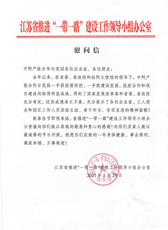 新春佳节来临之际,江苏省推进“一带一路”建设工作领导小组办公室向中阿产能合作示范园发来慰问信,对过去一年所取得的工作成绩表示肯定,向广大建设者致以节日的问候。