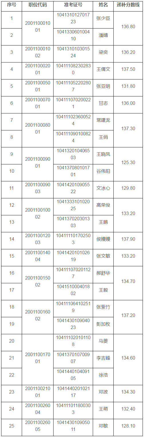 因部分考生放弃面试资格,根据公务员考录有关规定,按照笔试成绩从高到低顺序,递补以下考生为面试人选(按准考证号排序):