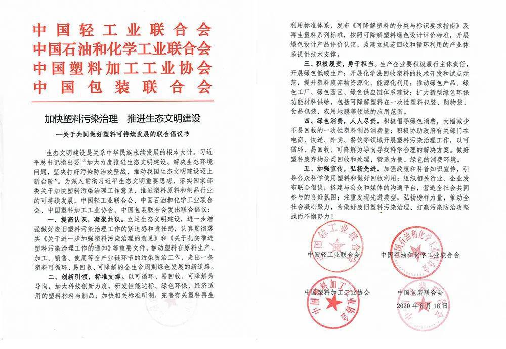 与此同时,中国轻工业联合会、中国石油和化学工业联合会、中国塑料加工工业协会、中国包装联合会面向全行业发布《加快塑料污染治理 推进生态文明建设——关于共同做好塑料可持续发展的联合倡议书》。