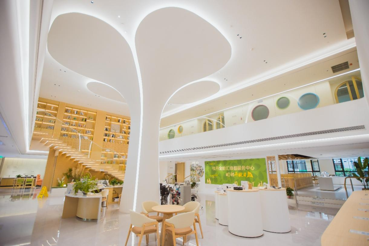 牡丹全龄汇绿都服务中心位于江苏省常州市新北区三井街道,是由区、街道、社区与国有控股上市公司多方合力打造的嵌入式社区全龄服务综合体,建筑面积达9800平方米,在全市同类项目中规模最大。项目以“15分钟生活圈”为服务半径,辐射周边17个小区、10万居民,聚焦“一老一小”核心需求,整合养老、托育、社区餐饮、文娱等多元服务,构建起代际共融、全龄照护的高品质康养生态,成为新北区“智慧养老服务创新体验中心”的落地载体。