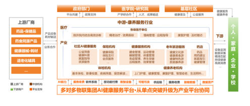 “AI健康管理服务平台”以“技术融合、价值共生、全链协同”为核心,构建开放合作生态,集结多元主体共生。创新性地整合医疗机构、健康机构、药店、保险机构、健康从业者、家庭、社区、学校等医疗健康服务行业上游厂商、中游机构、下游用户及相关资源于同一生态系统,贯穿健康产业价值链的全过程。突破传统健康产业“单点服务”的局限,向“全链条协同”转型和发展;从单点突破升级为产业协同,多维度提升老年人健康服务水平,减轻家庭与社会负担,提升服务效果和产业持续效益,助力社区治理和政府科学决策。
